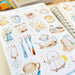 A sticker sheet for the tea lovers. This detailed sticker sheet contains lemon tea, a tea infuser, a kettle, multiple tea bags, and much more to decorate your bullet journal or planner.