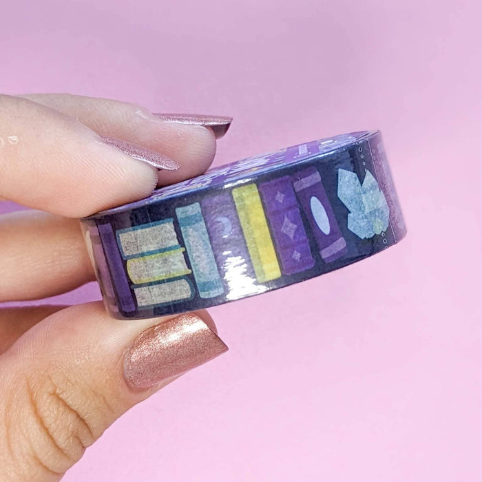 This washi tape features a celestial inspired bookcase filled with jewel toned books, astrological equipment, candles, crystals, curiosities, and more.
