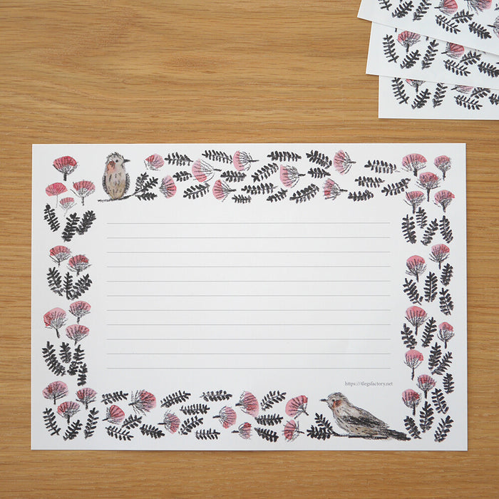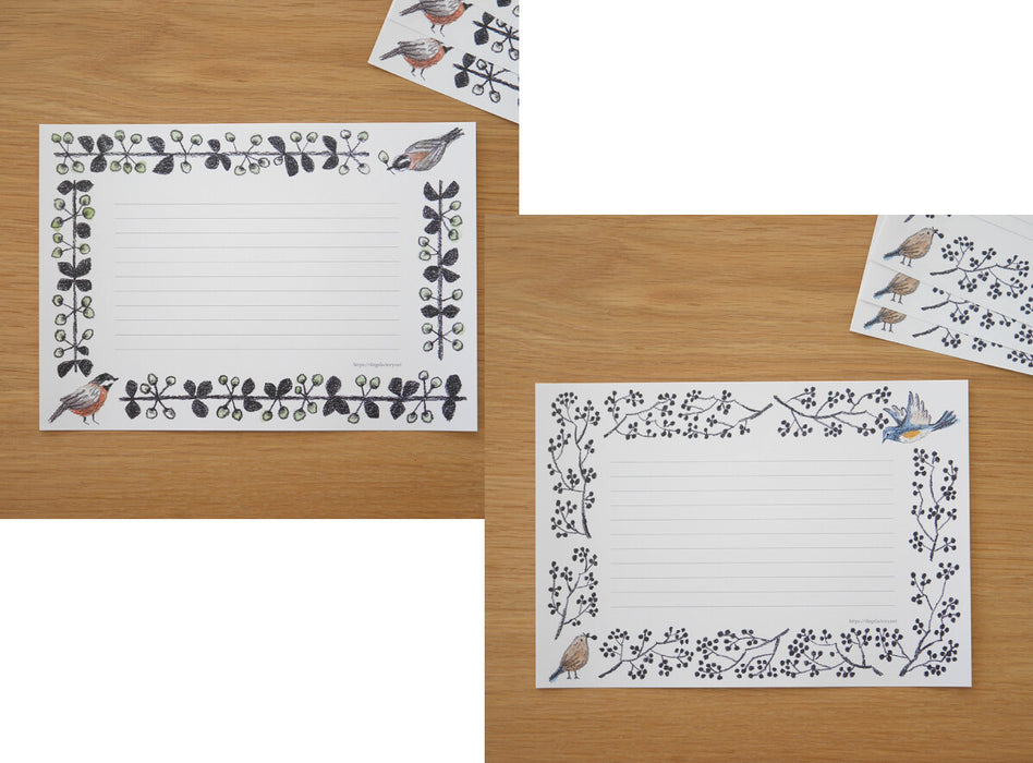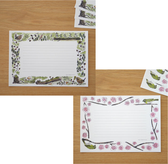 Pen a handwritten note today with this beautiful pack of lined writing paper featuring original illustrations of various Japanese wild birds together with some of the trees and plants associated with each bird.