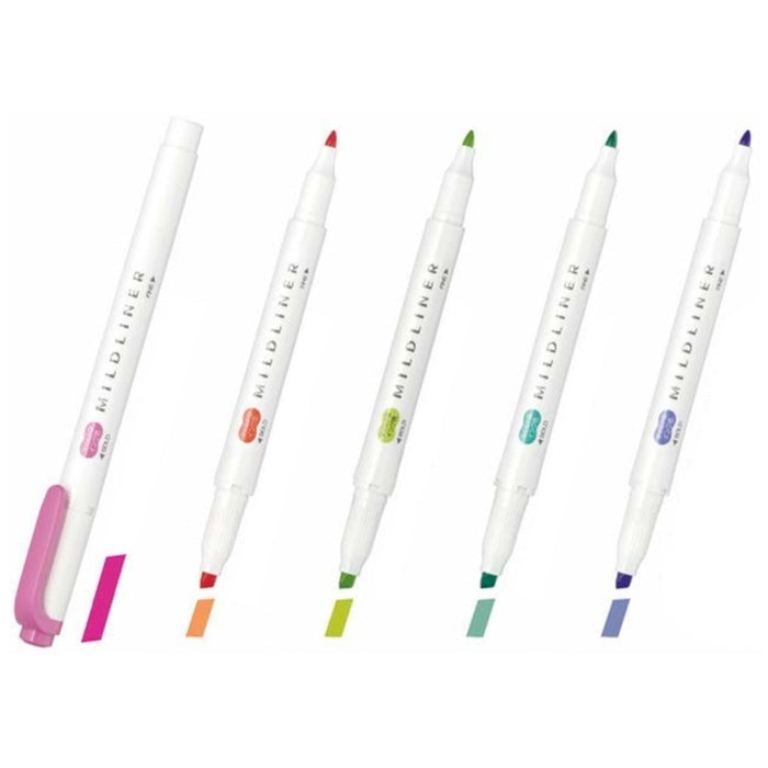 Zebra Mildliners feature a mild, bright hue and have water-based ink and a double-sided tip design - a standard chisel tip on one end for normal highlighting and a fine bullet tip on the other for underlining, circling and writing notes.