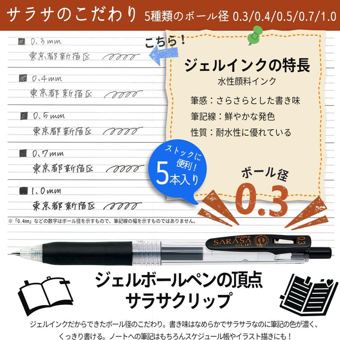Zebra Sarasa Clip Gel Pen 0.3mm - Black - 5 Pack