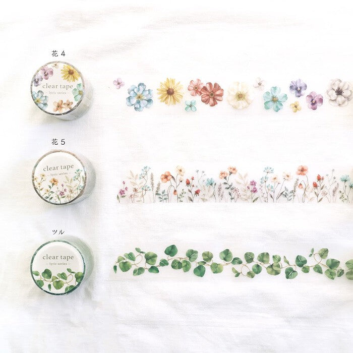 A PET material tape with a transparent background and delicate floral print in subdued tones. The surface of the tape has a matte finish that blends well with paper, making this tape perfect for decorating planners and notebooks.