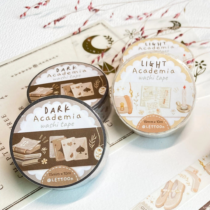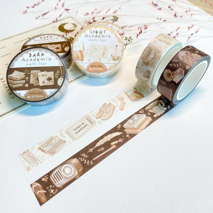 Dark Academia Washi Tape features vintage keys, parchment, old books and more on a dark background.