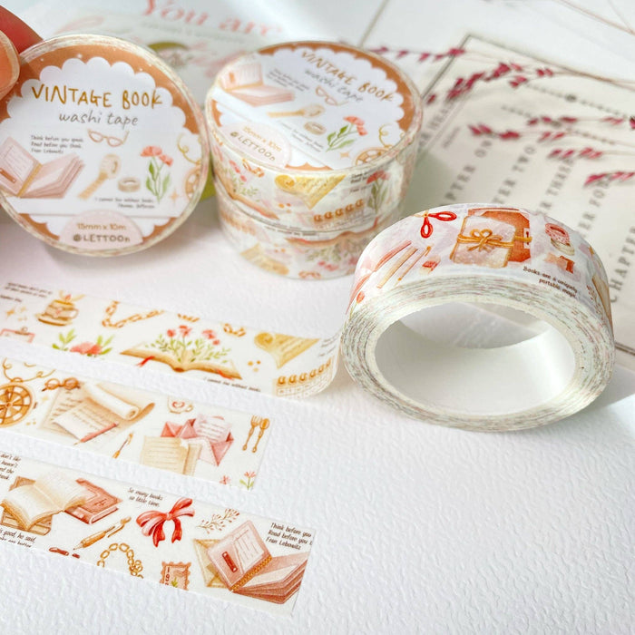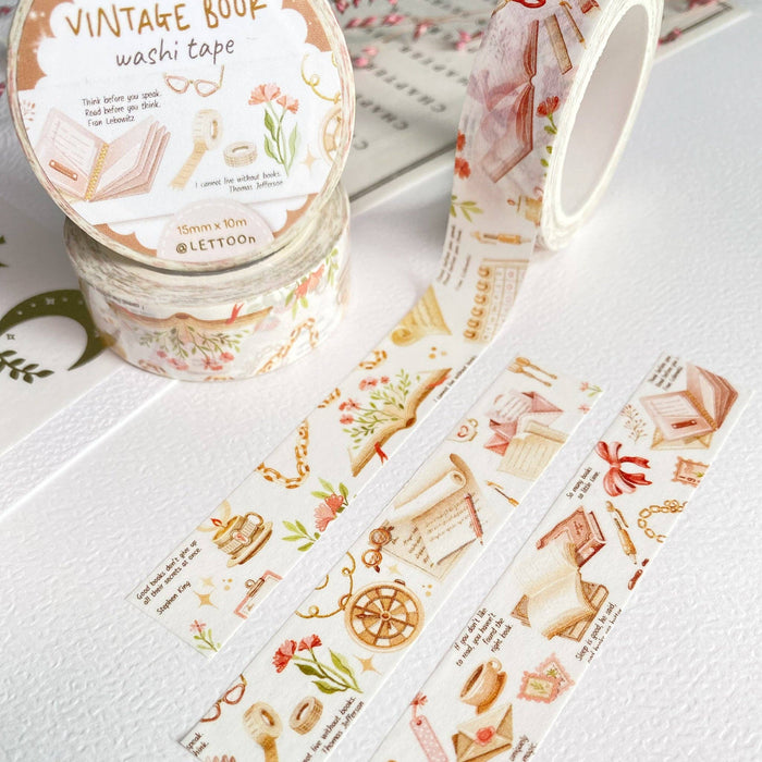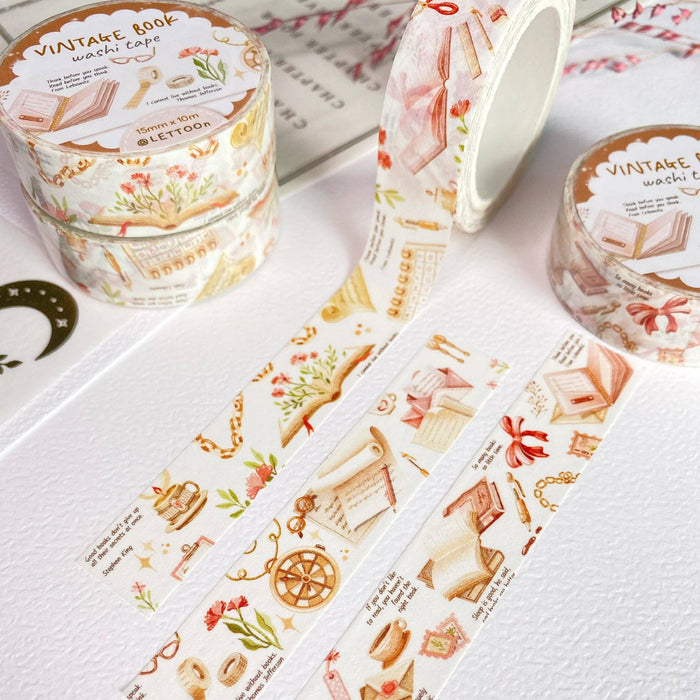 Vintage Book Washi Tape features envelopes, flowers, vintage items, books, famous quotes, and more!